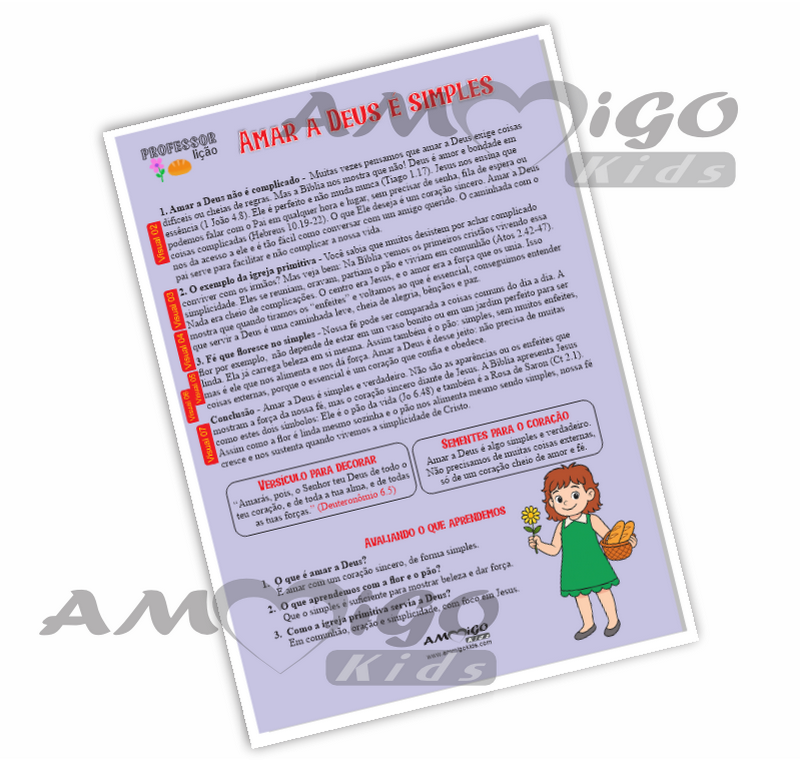 Esta aula foi preparada especialmente para mostrar às crianças que amar a Deus não é complicado, mas algo puro e verdadeiro. Através de ilustrações simples, como a flor e o pão, a lição ensina que a fé não depende de enfeites ou aparências, mas de um coração sincero diante de Jesus.