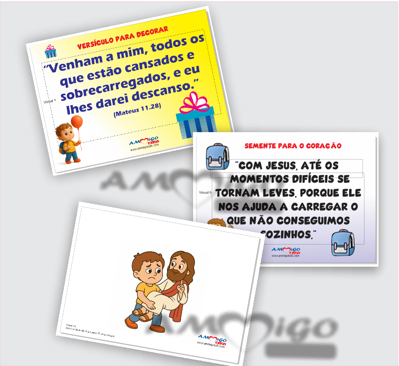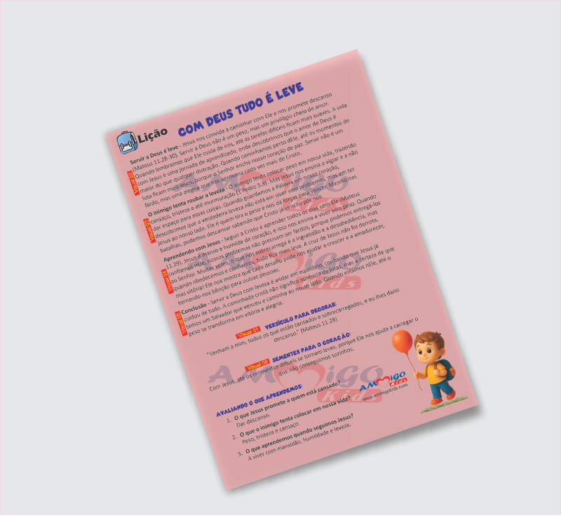 Esta aula em PDF foi criada especialmente para o ministério infantil, trazendo um conteúdo completo e fácil de aplicar. Com base em Mateus 11.28-30, a lição mostra às crianças que servir a Deus não é um peso, mas uma caminhada leve e cheia de alegria em Cristo.