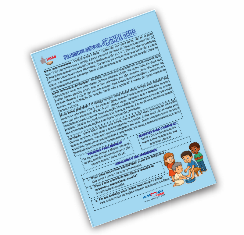 Ensinar crianças a servirem com alegria e amor nunca foi tão simples! A aula “Pequenos servos, grande Deus” foi preparada com uma didática clara e envolvente, sendo uma ferramenta prática para professores do ministério infantil que muitas vezes não têm tempo para longas preparações.